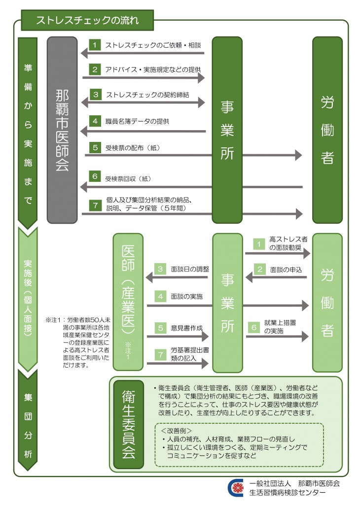 労働安全衛生法の改正によって50人以上の労働者がいる事業所で義務付けられた検査です。定期的に、労働者のストレス状況について検査を行い、その結果を労働者本人へ通知し、自らの”心身の状態”への気づきを促します。また個々の検査結果を集団ごとに分析し、事業所が組織的に職場環境の改善につなげることで、労働者のメンタルヘルス不調を未然に防ぐ一次予防を目的にしております。